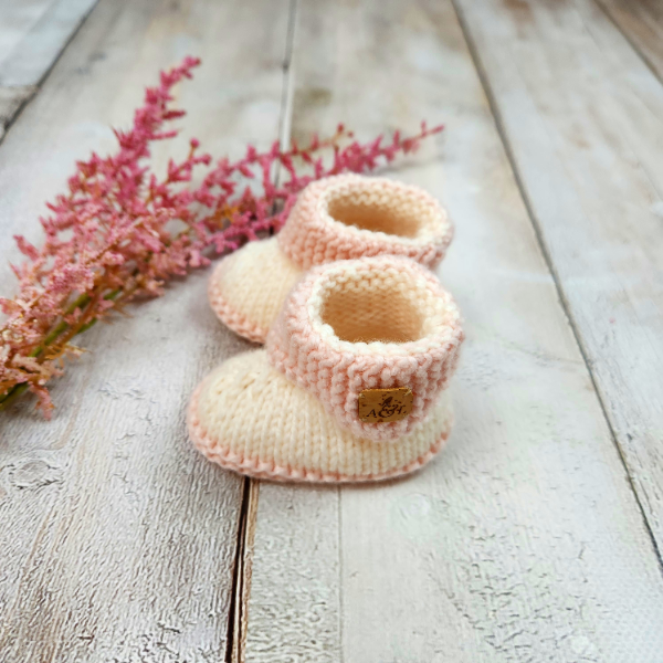 Hand-knitted from soft, machine-washable baby yarn in pink and cream, the Amara Booties are designed for newborns (AU size 0000).