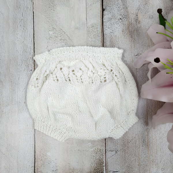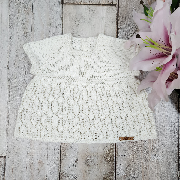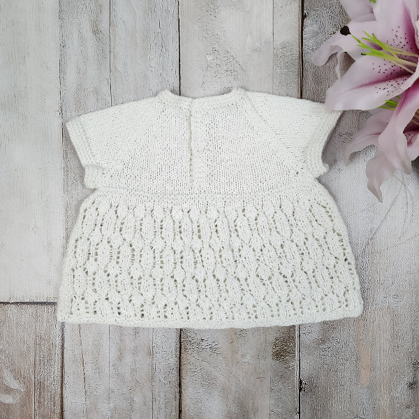 The Daphne dress set is a light and delicate summer outfit, lovingly hand knitted in fine white cotton. Designed to suit newborn babies (AU size 0000), this timeless set is perfect for warm-weather wear, special occasions, or newborn photos.
