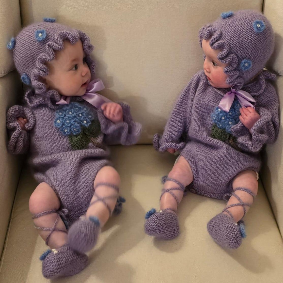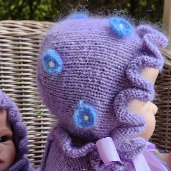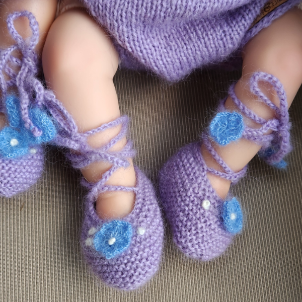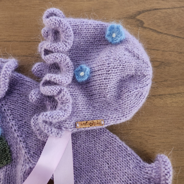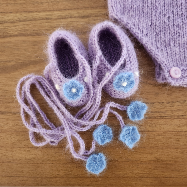 Knitted from a luxuriously soft and warm lavender mohair blend yarn, this set is as gentle as it is stunning—perfect for keeping your baby cozy while looking picture-perfect.