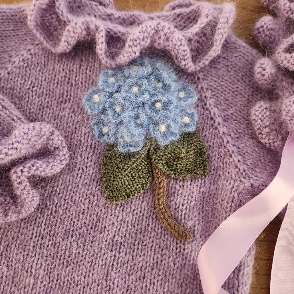 A long-sleeved romper, featuring a standout hand-knitted hydrangea motif on the front, delicate frill detailing around the neckline and sleeve cuffs, and a cozy, comfortable fit