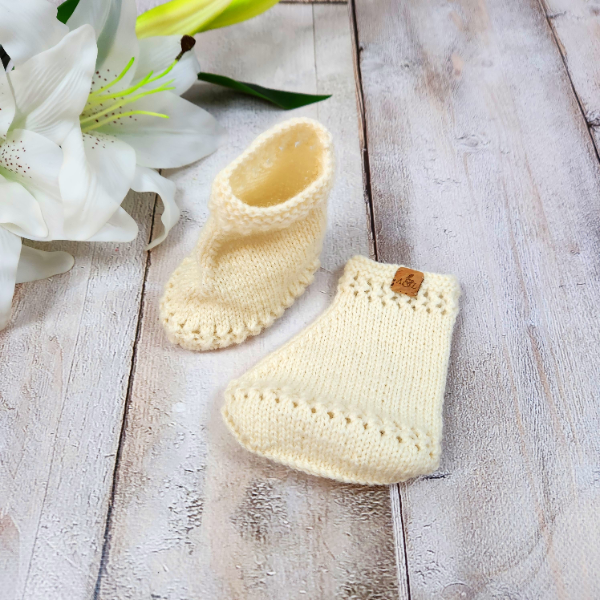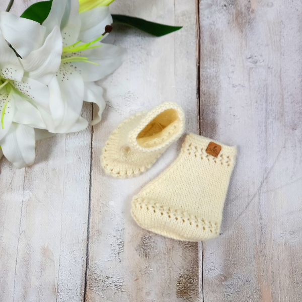 A timeless pair of hand-knitted booties, designed to suit babies aged 3–6 months (AU size 00). Made from soft cream wool yarn, these booties have a beautiful antique, traditional-inspired look.