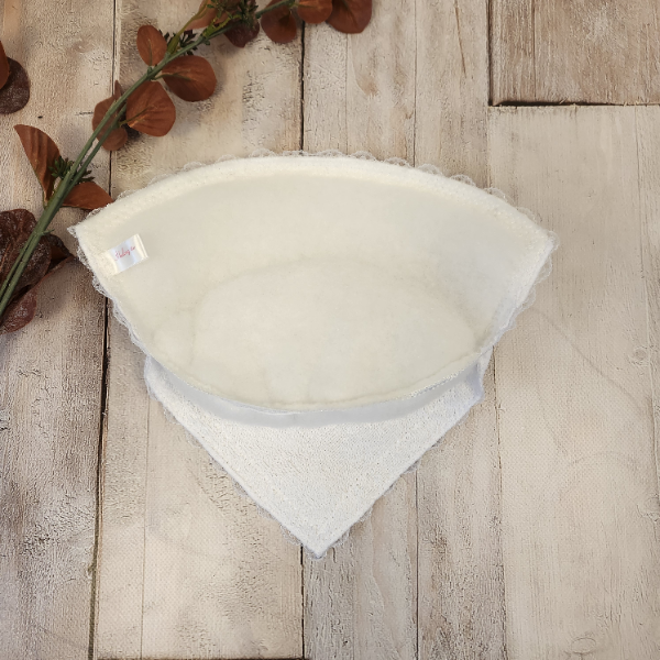 This towelling overlay scarf shape features a standard elasticated back design with a soft velour towelling overlay on top. The edges are neatly finished with lace for a delicate, elegant touch.