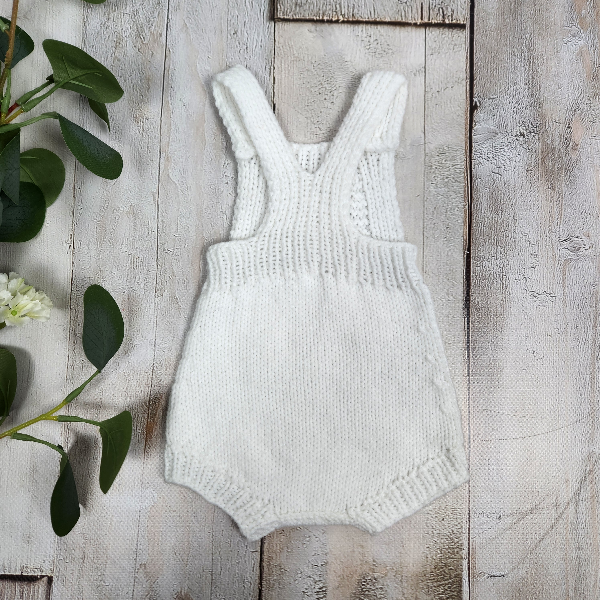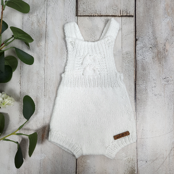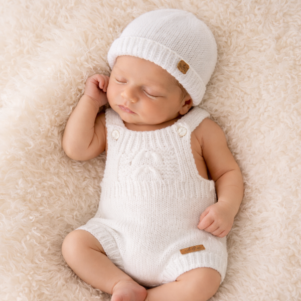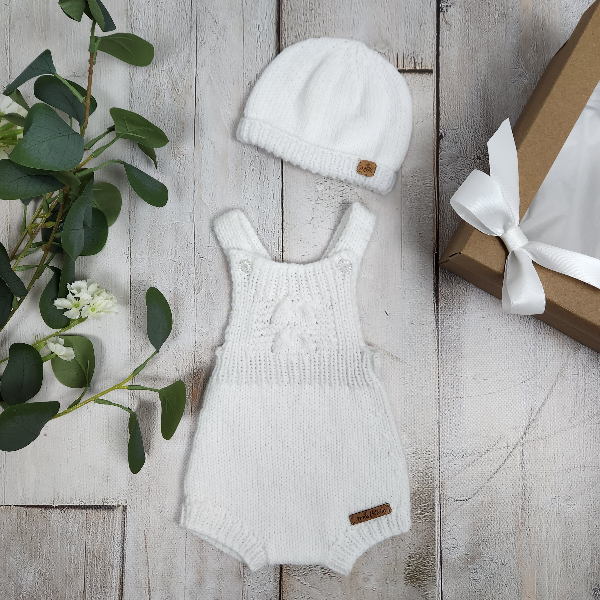 The romper features a delicate lace panel on the front, with ribbed bands on the straps, leg cuffs, and back for a comfortable, secure fit. A matching hand-knitted hat with a ribbed edge keeps baby’s head warm and cozy.
